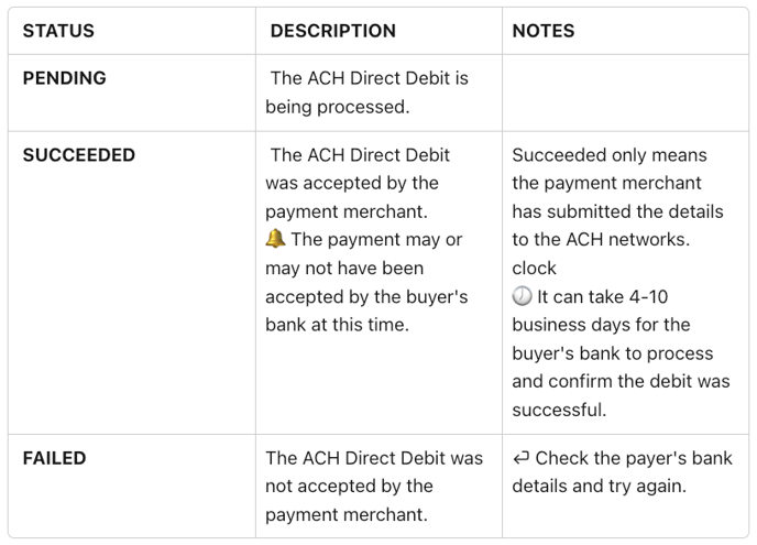ACH Direct Debit payment begins with the status of Pending. From there, you can review the three states for ACH Direct Debit payments below: