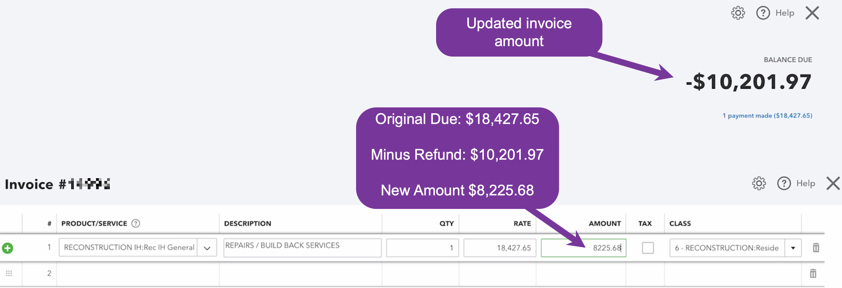 Reducing the invoice amount by the refund amount will also update the balance due. This is expected, so later, when you apply the refund check to the invoice, it will balance out.