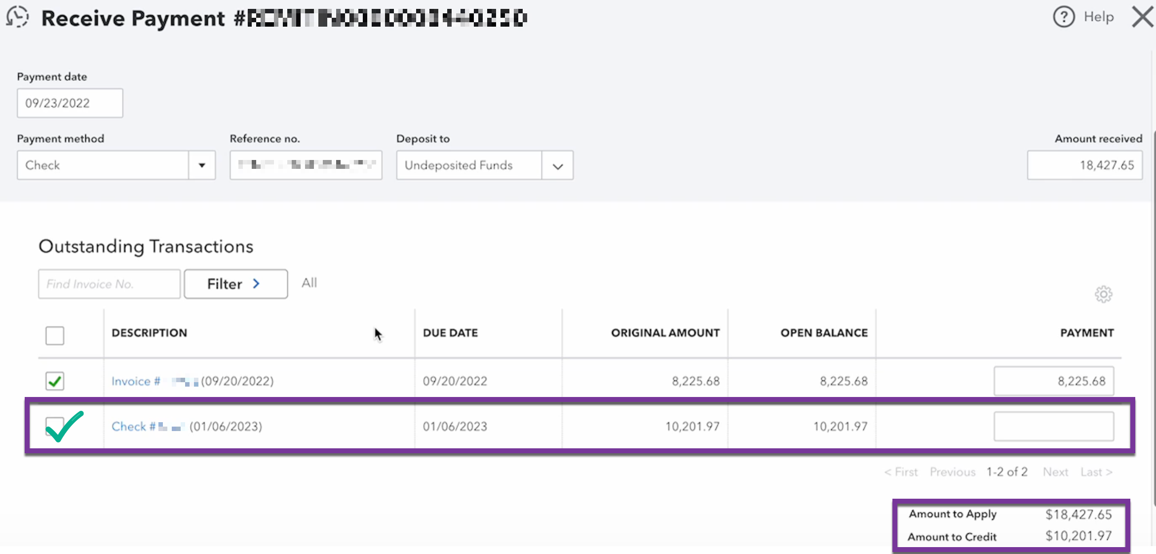 On the payment screen, you will notice the amount received is $18,427.65, and there is a check refund to apply of $10,201.97