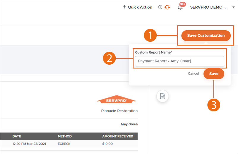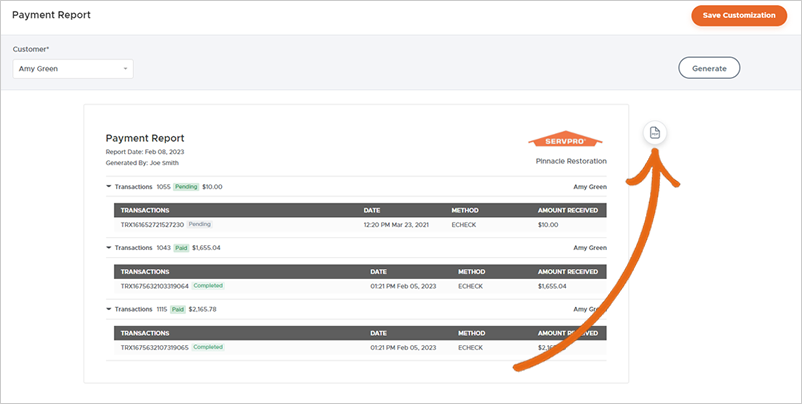 View all payment transactions for a unique customer in the Payment Report. You can save this report as a Customized Report or download a PDF copy.